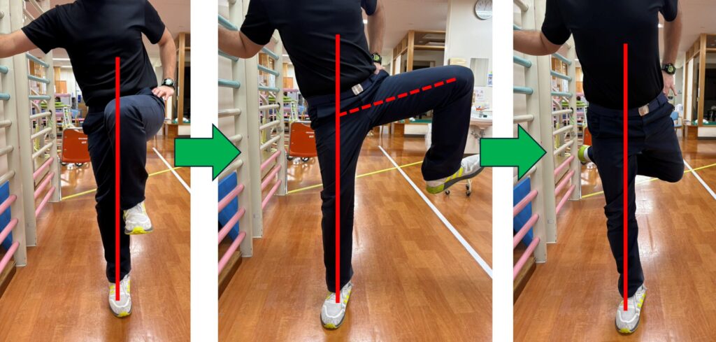 - 立っている足と体の中心が真っすぐになるように行う