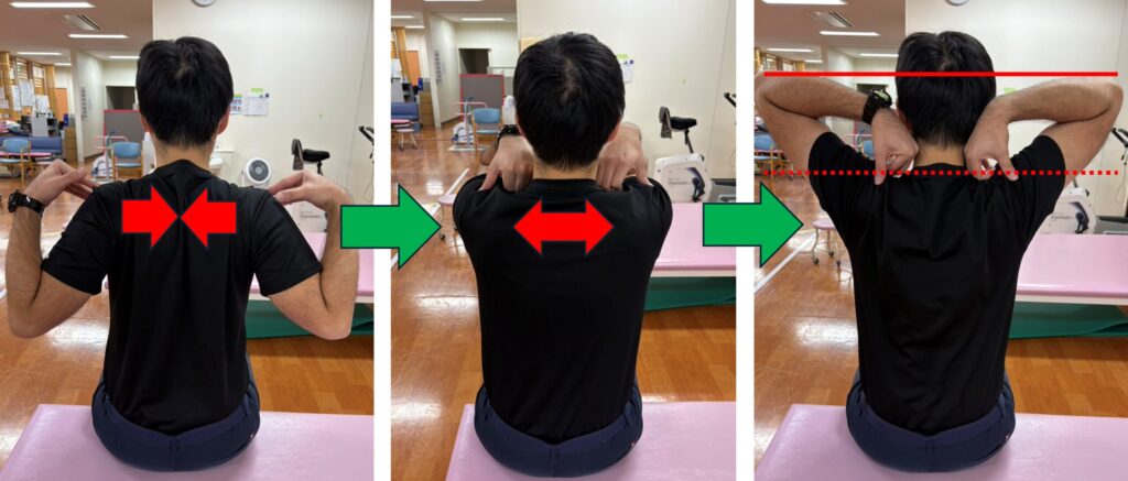 - 肘が自分の前にある時は、肩甲骨を開くイメージ